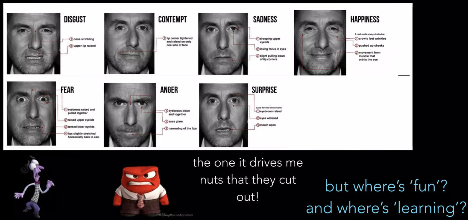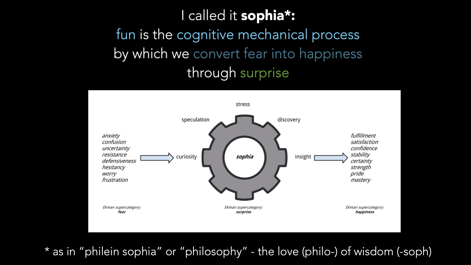 从两位著名学者的视角来看,人类20世纪的情绪研究中,Fun是一个模糊概念,不是人来的基本情绪。Fun不是所有的情绪但同时有可以是所有的情绪,快乐、悲伤、愤怒、恐惧、厌恶、惊讶、轻蔑,都可以是有趣的。学着Erin hoffman提出了,Fun是一个过程:是人类认知机制的过程,在这个过程中人们把害怕(根据ekman的大分类包括焦虑、迷惑、不确定性、抗拒、防御、迟疑、担忧、挫败)转换成为开心(包括满足、舒服、自信、稳定、确定、强力、自豪、掌握),游戏过程经历了惊奇(好奇、推测、压力、发现、洞察)。