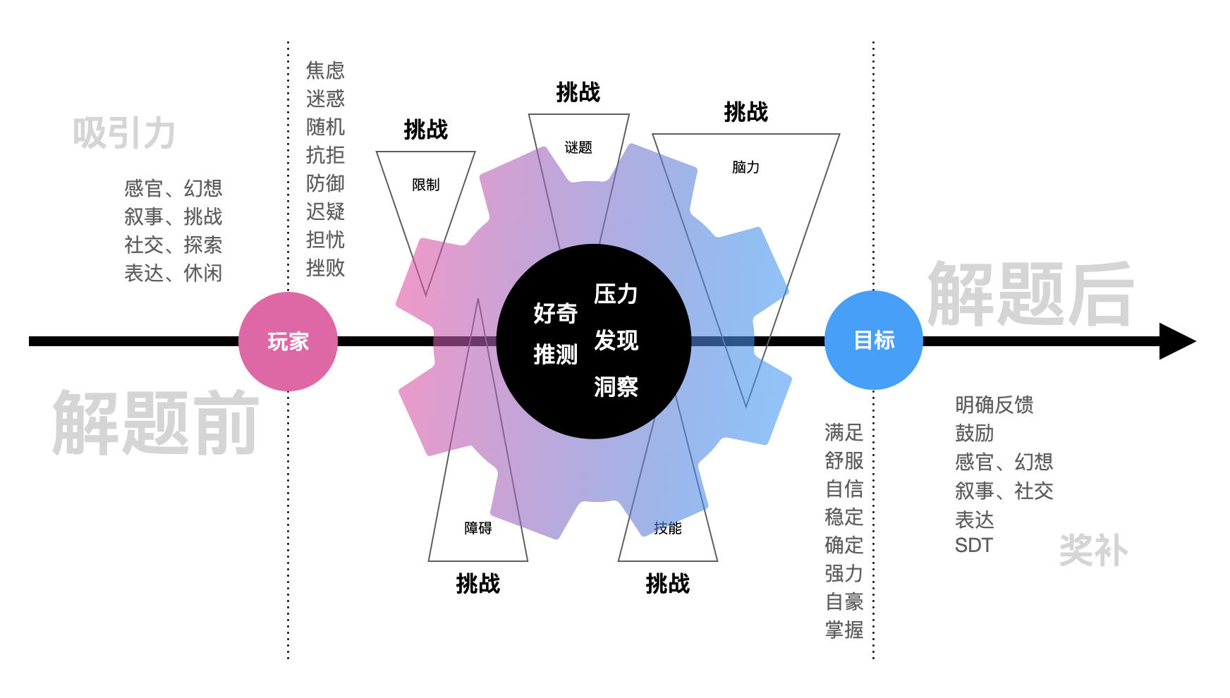 最后,从有趣的问题角度来解读。玩家是解题者,结果过程中的三个阶段:解题前、解题中、解题后