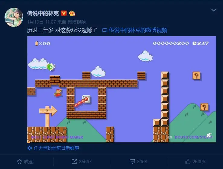 值得说明的是,林克能成为主播并不只是因为他游戏玩的好,还有一点是他地图做得好,而且特别“毒”。在《超级马里奥制造》和部分游戏圈子里,有“毒图”一词,用来形容一些“容错率低,操作上要求极高,且十分消耗耐心”的变态图。正如之前所说,《超级马里奥制造》地图的上传规则是作者必须先自己通关。这就意味着想做“毒图”的话,要在毒别人之前,先毒一毒自己。林克最常毒到的,恐怕就是他本人。在1月19日通关的这张地图上,林克用掉了3千条命和30多个小时。“不过这还不算最多的。之前有死了上万次,用一个月才上传的图,这么一比不是很难”,林克又补充道:“但是说不是很难,观众们也不同意”。他所说的这张“死了上万次才上传”的地图叫作“林克的大冒险”,通关过程也被林克放在了微博上。